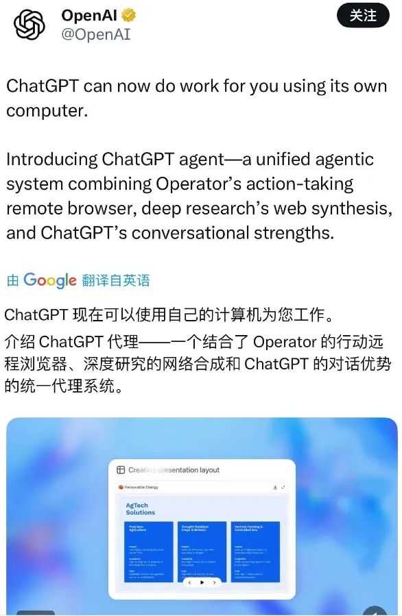 北京时间18日凌晨,OpenAI发布ChatGPT Agent。ChatGPT Agent一个重要功能模块是其多工具集成能力,将Operator的网站交互能力、Deep Research的信息整合能力以及ChatGPT的深度对话能力融合在一起,形成统一的智能体系统。